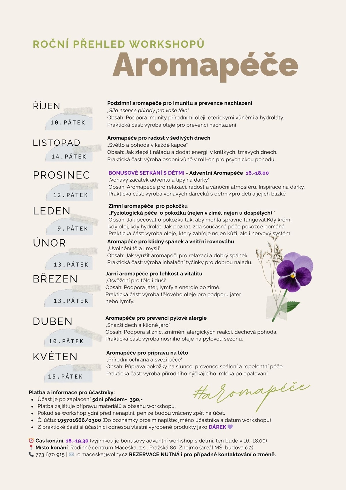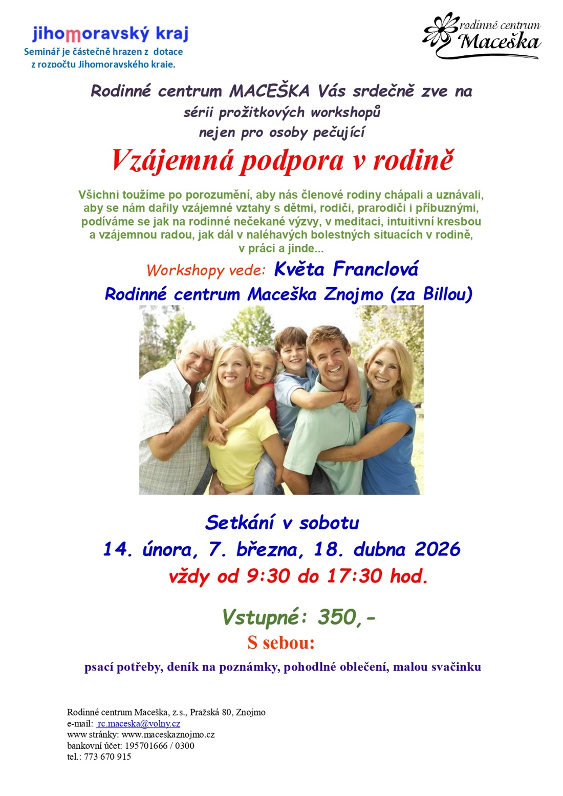 Rezervace nutná telefonicky. Platba 5 dní předem na účet. Kontaktní údaje jsou v letáku.